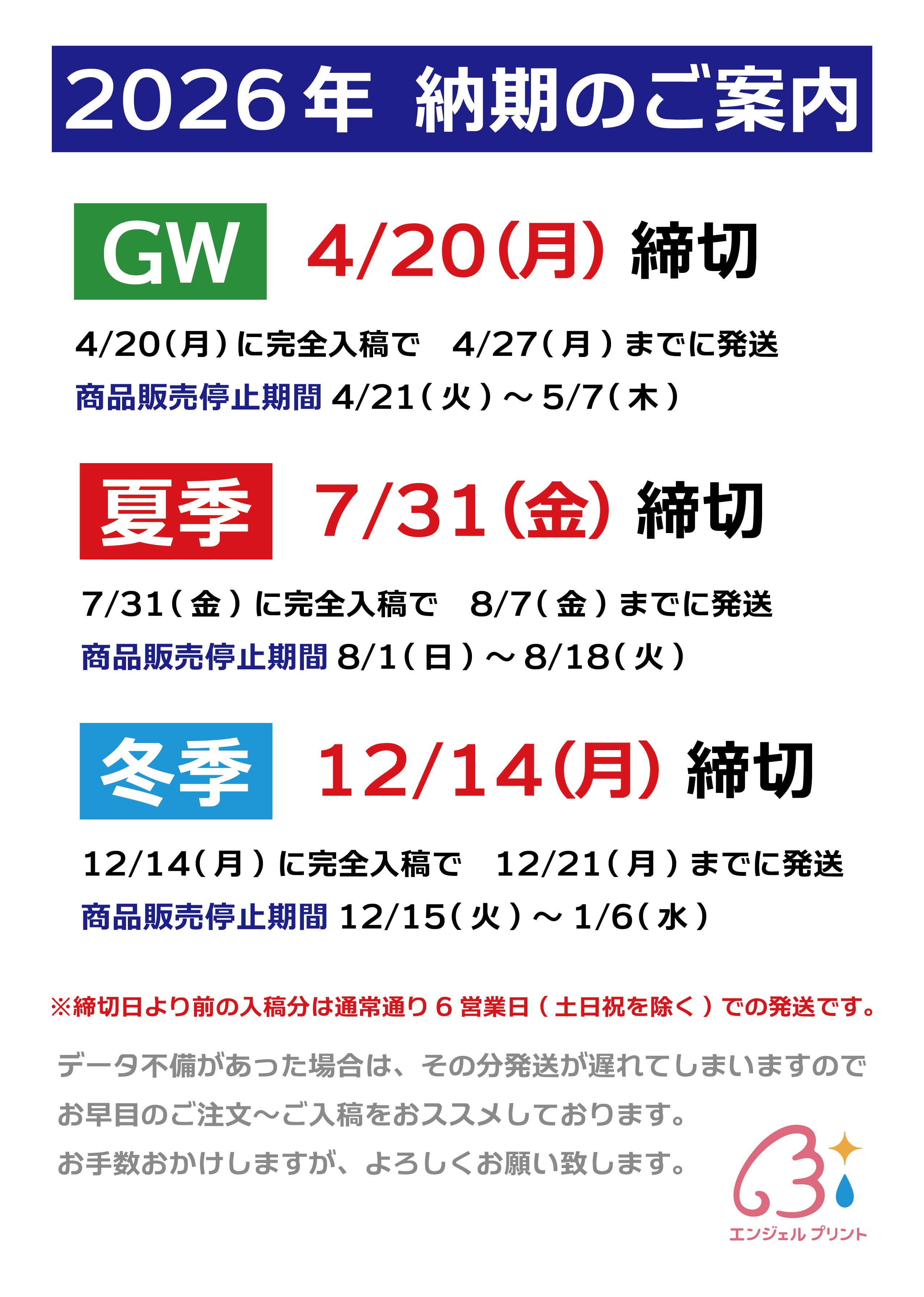 ・納期は完全データ入稿後、6営業日(※土日祝を除く)です